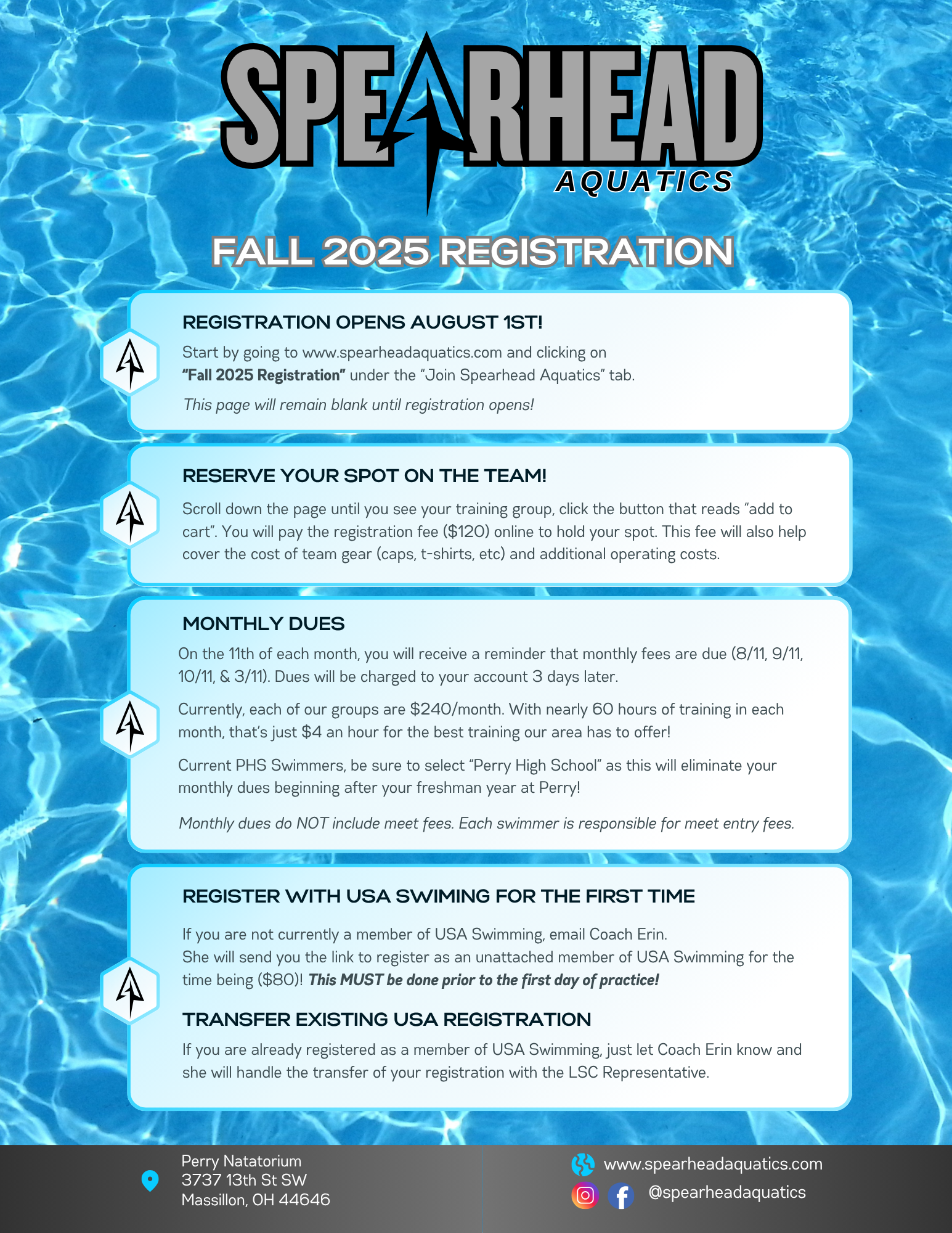 If you have any additional questions regarding evaluations, registration, or other questions about the SPEARHEAD AQUATICS program, please email [email protected].